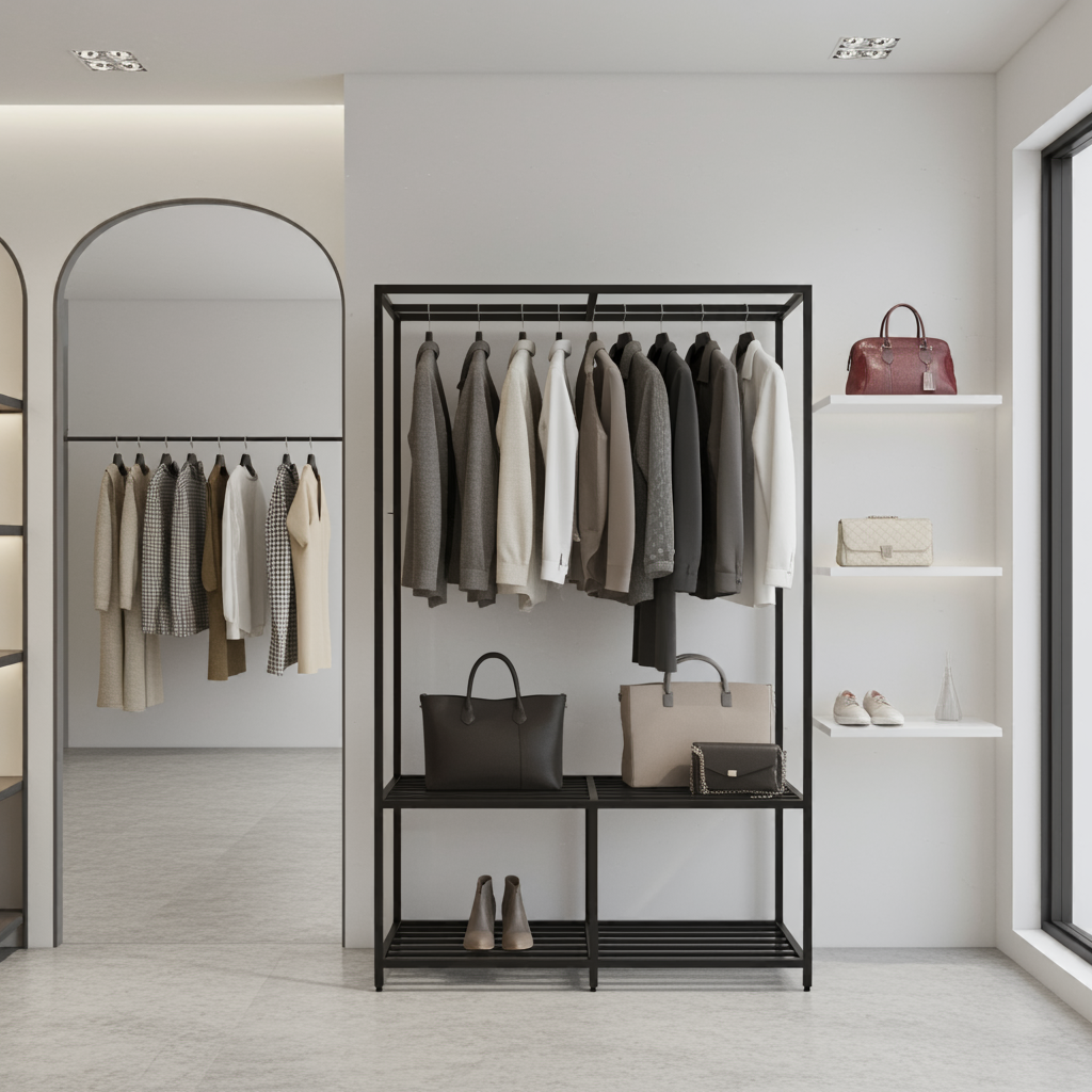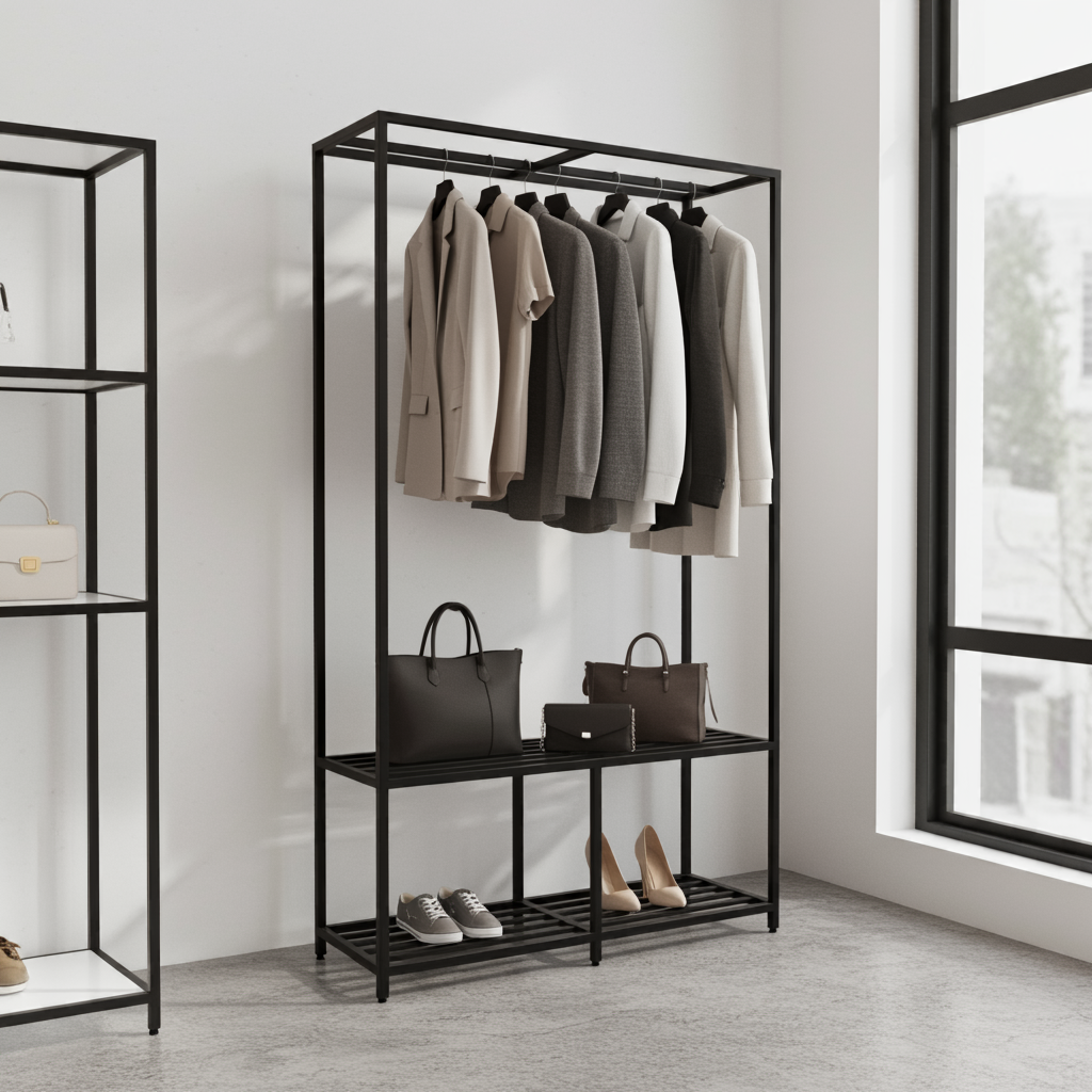 • Funkcjonalność: Wolnostojąca konstrukcja z górnym drążkiem na ubrania i dolną półką na akcesoria.