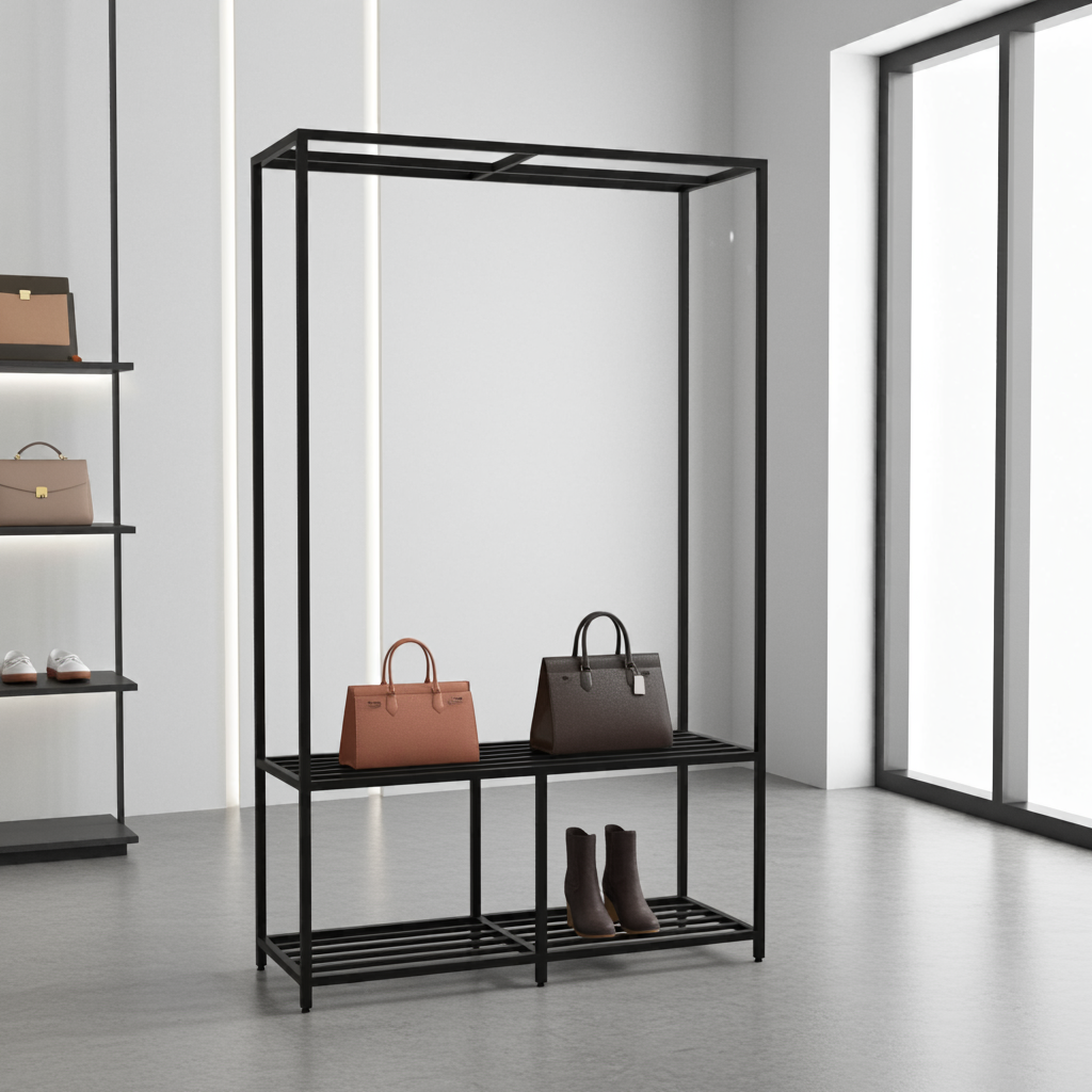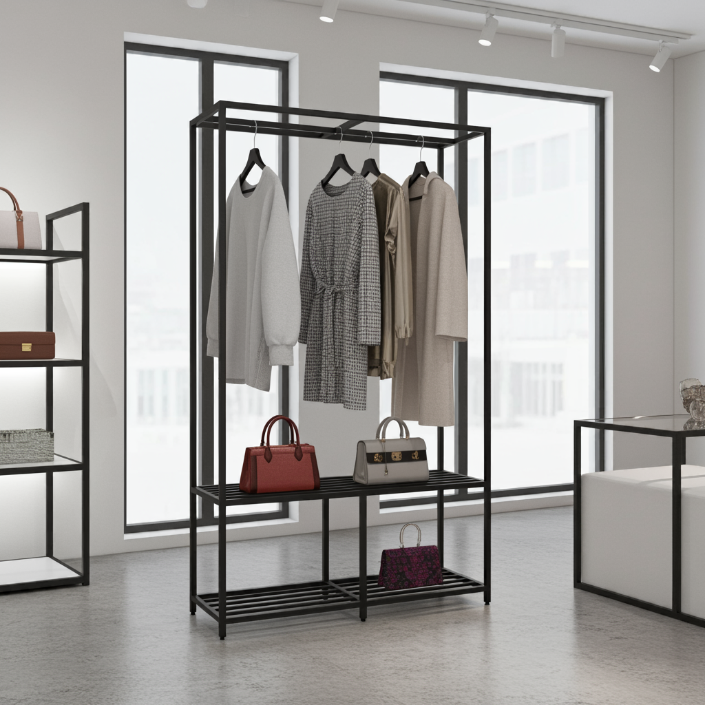 "Modern Black" to nie tylko miejsce na odzież. Wyposażony w praktyczną półkę na torebki, buty lub inne akcesoria, pozwala na kompleksową ekspozycję stylizacji, zachęcając klientów do kompletowania zestawów. Górny drążek zapewnia dużo miejsca na zawieszenie ubrań, a stabilna konstrukcja gwarantuje bezpieczeństwo i trwałość.